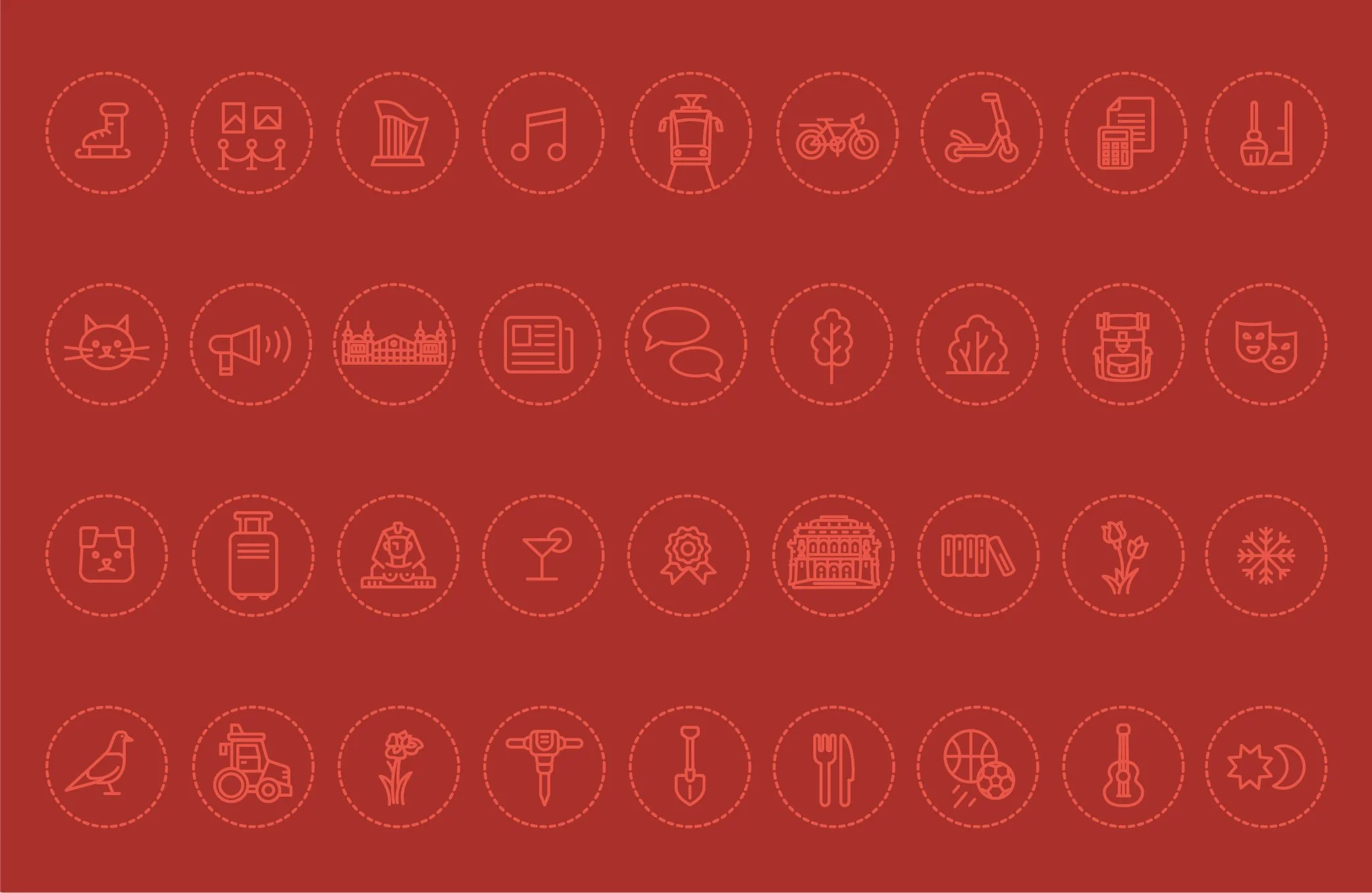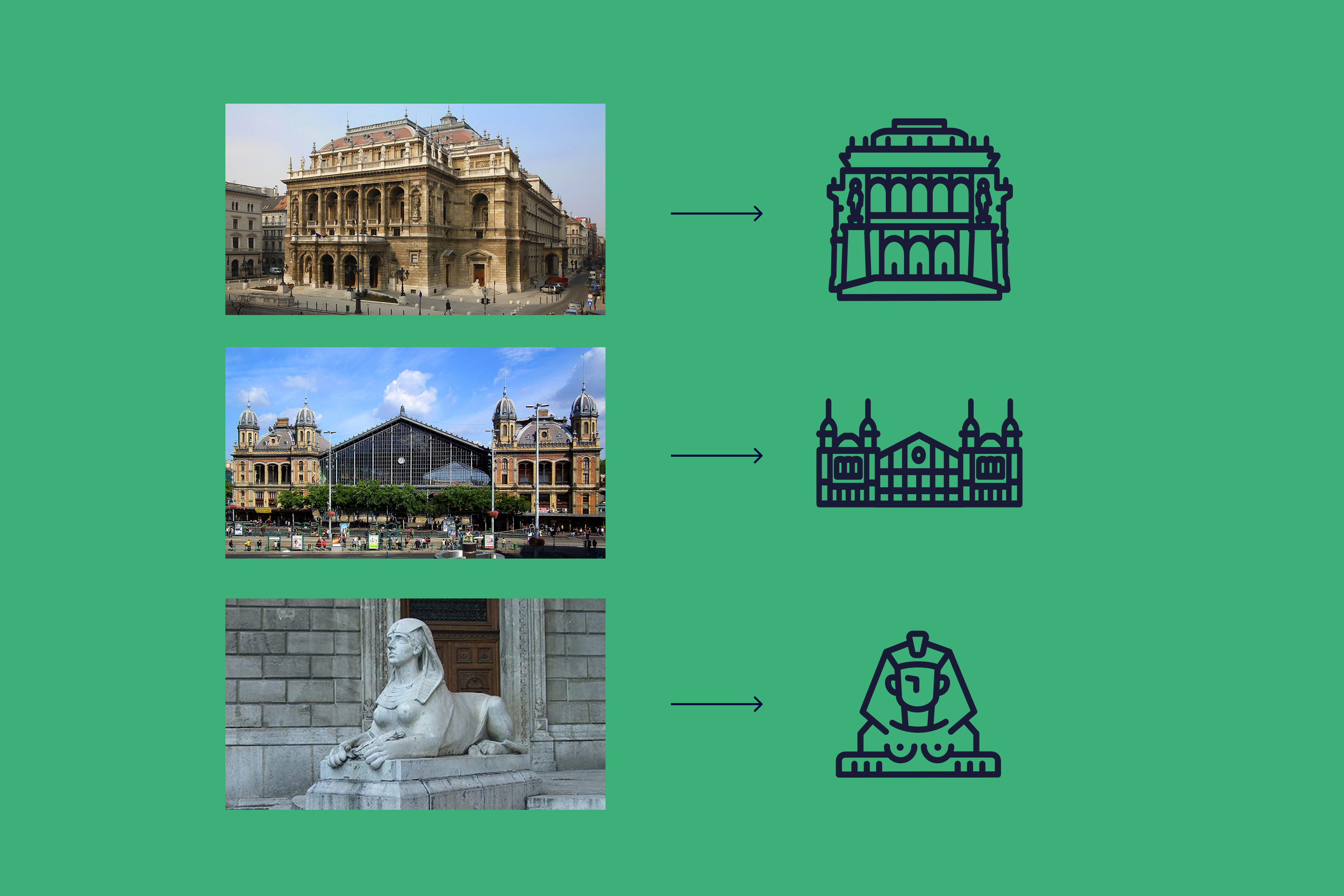 The icon set had already been a popular component of the previous design, so we expanded the collection with new, site-specific symbols such as the Opera House, the Nyugati Railway Station, and the sphinx in front of the Opera, highlighting the rich architectural heritage of the Terézváros district.